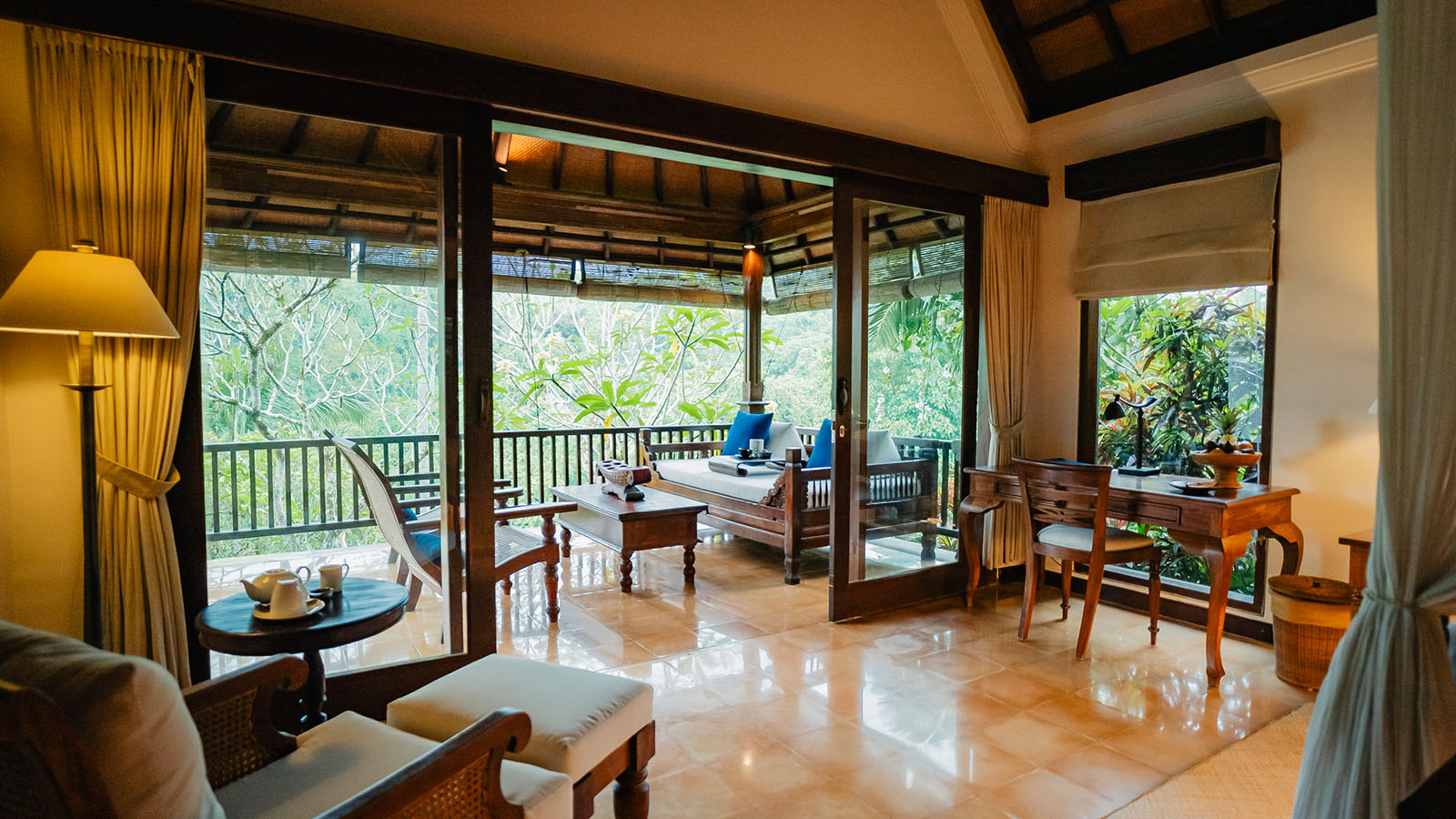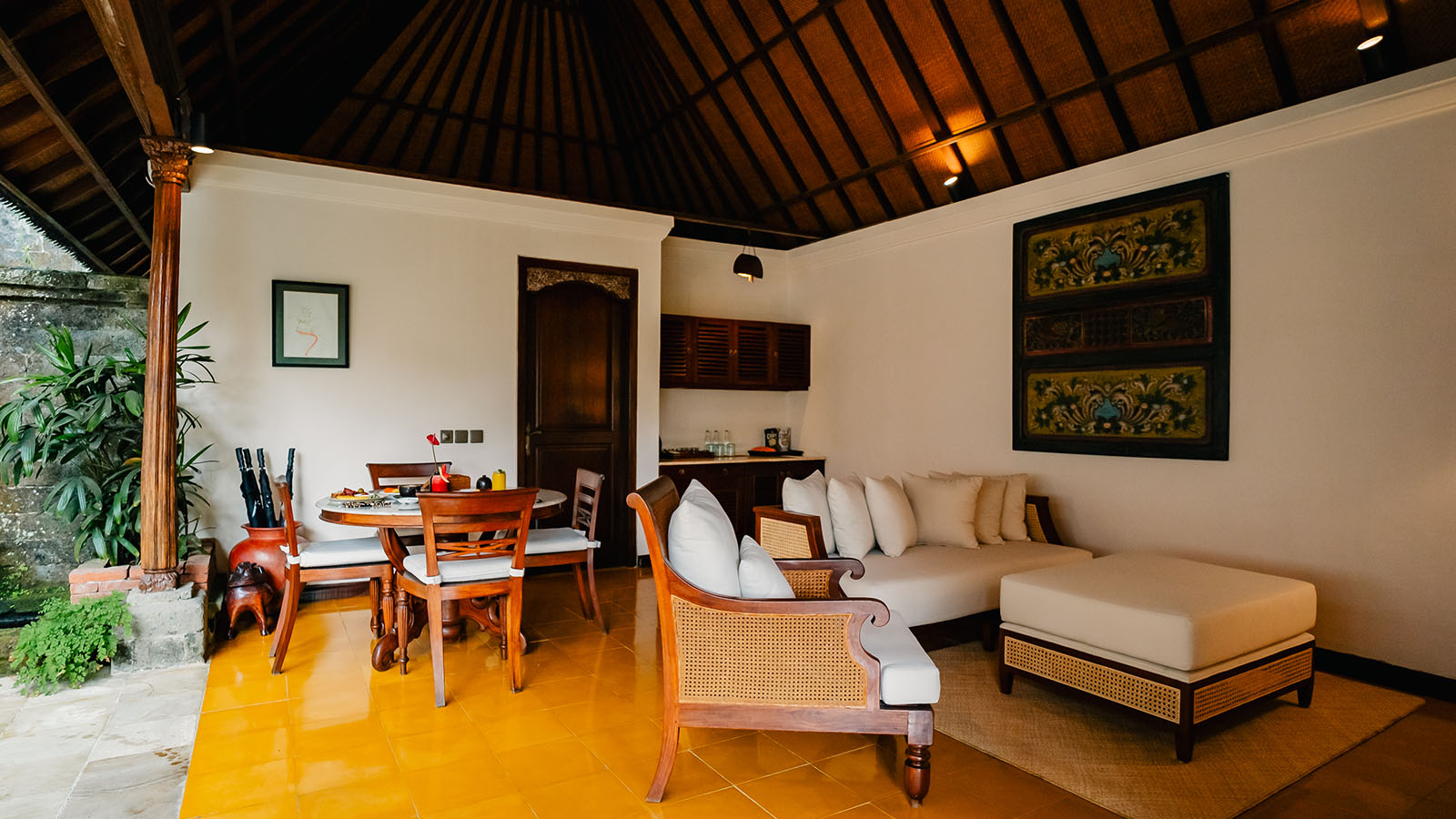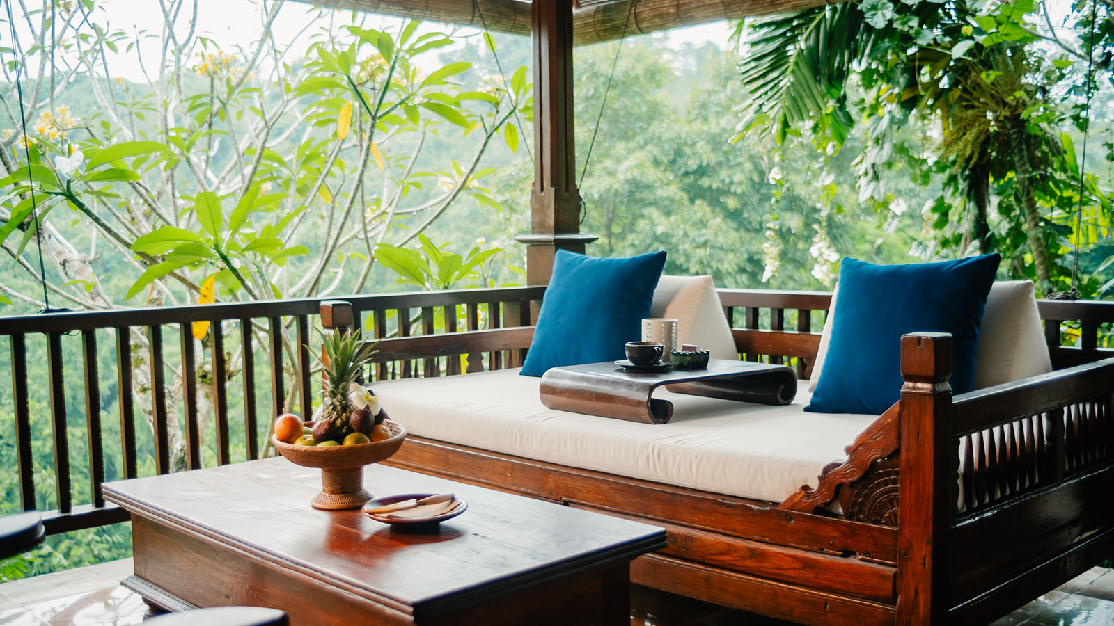 Experience ultimate comfort in our Frangipani villa, a two-bedroom infinity pool villa set in a secluded, elevated location with stunning views across the river ravine and jungle. This family-style villa features traditional Balinese furniture and soft furnishings. The living space includes cozy lounge seating and a dining area, with deck loungers by the pool for relaxation. The master bedroom boasts a king-size canopied bed, an ensuite bathroom, a study area, and a balcony, while the second bedroom offers twin beds.