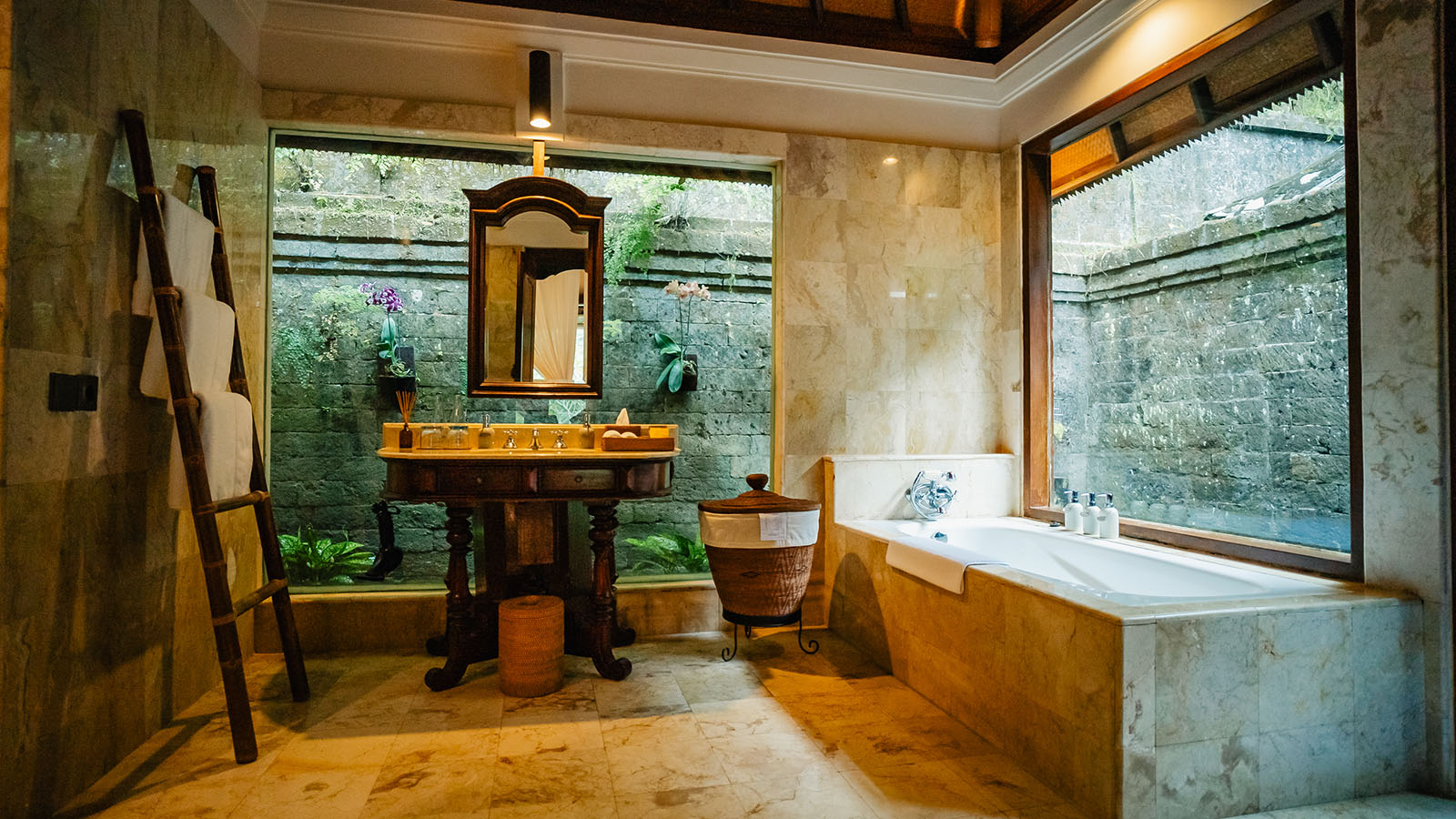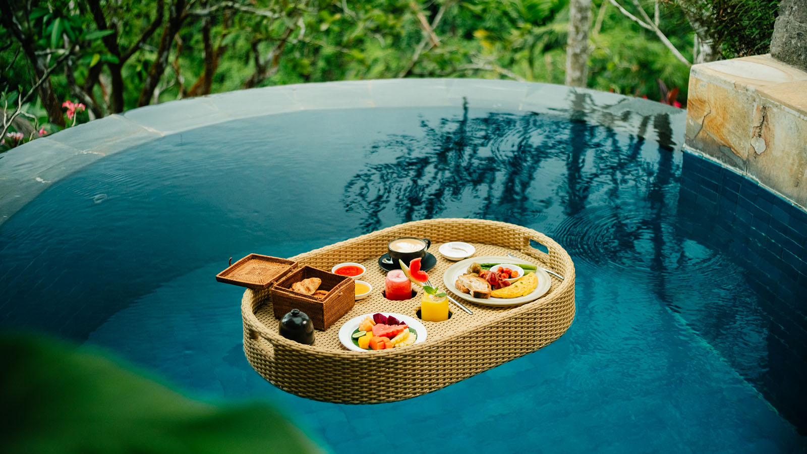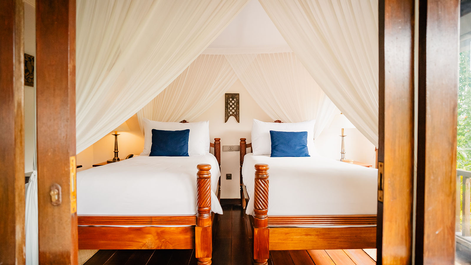 Experience ultimate comfort in our Frangipani villa, a two-bedroom infinity pool villa set in a secluded, elevated location with stunning views across the river ravine and jungle. This family-style villa features traditional Balinese furniture and soft furnishings. The living space includes cozy lounge seating and a dining area, with deck loungers by the pool for relaxation. The master bedroom boasts a king-size canopied bed, an ensuite bathroom, a study area, and a balcony, while the second bedroom offers twin beds.